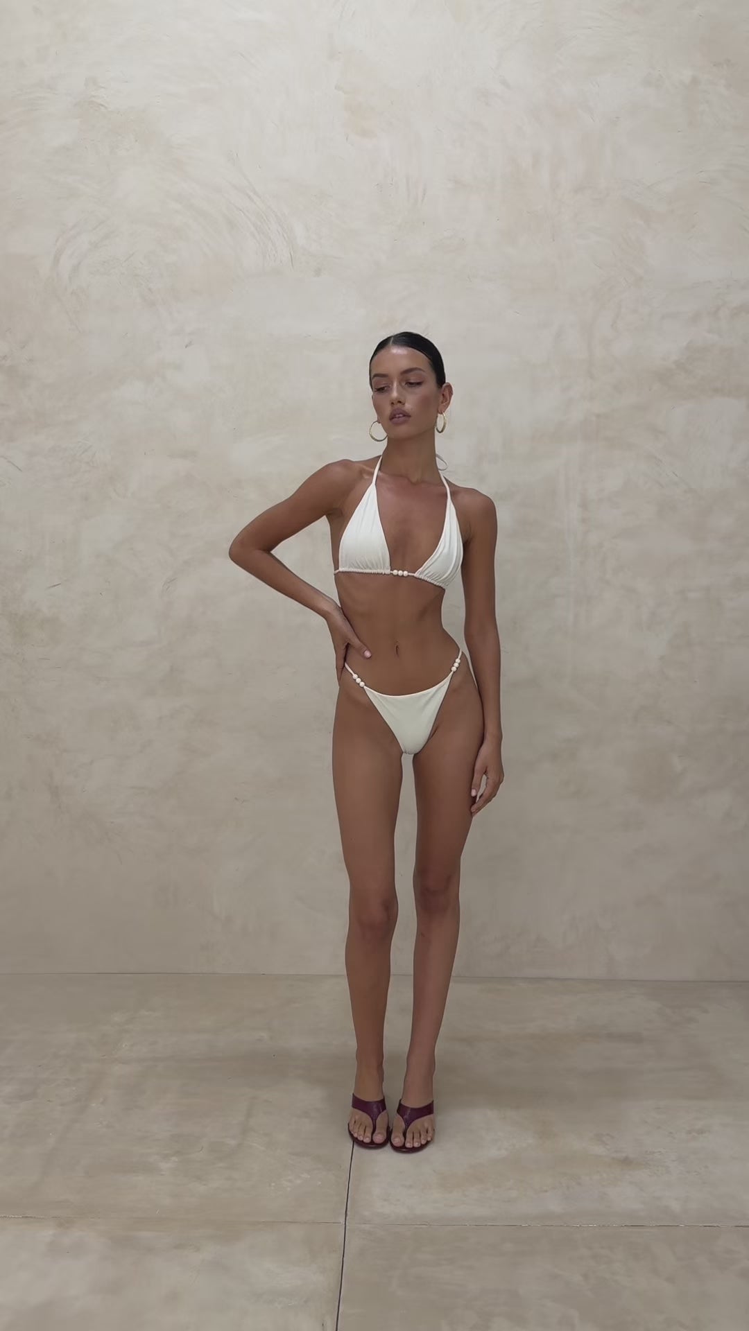 Minimal, elegant, and effortlessly feminine — the Edelweiss Top is a classic triangle bikini top elevated with delicate bead detailing at the center. Designed in a soft Cream hue, it ties at the neck and back for adjustable comfort and a flattering fit. Whether lounging poolside or catching waves, this piece brings timeless charm to your swimwear collection.