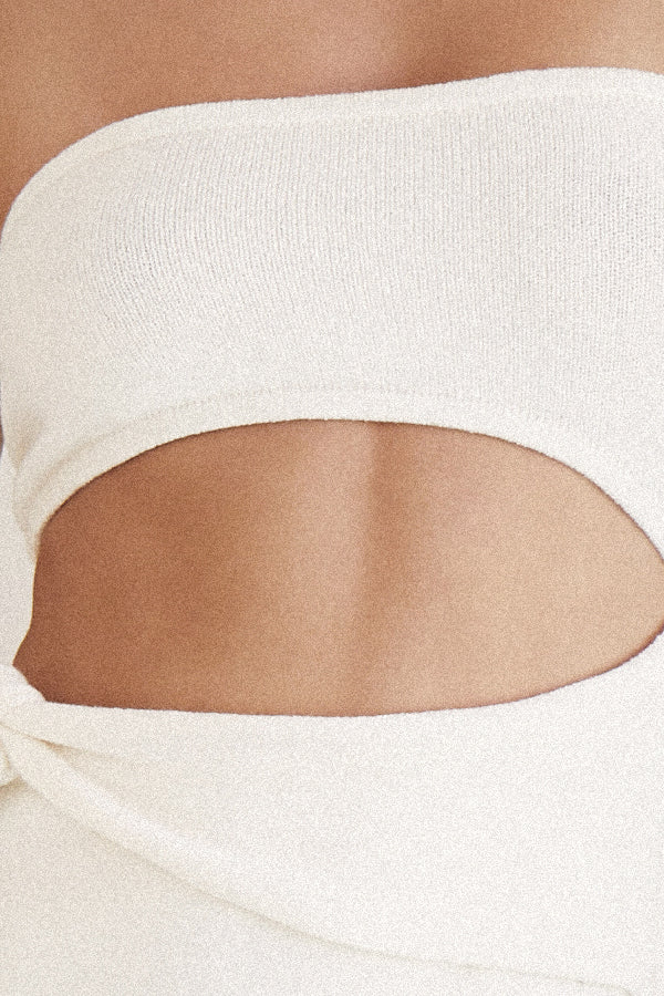This spandex knit midi dress is elasticized at the top and under the bust to hold the garment in place. It has a knit tie band as a feature. It features in spice and also comes in off-white, black, and sage colors.