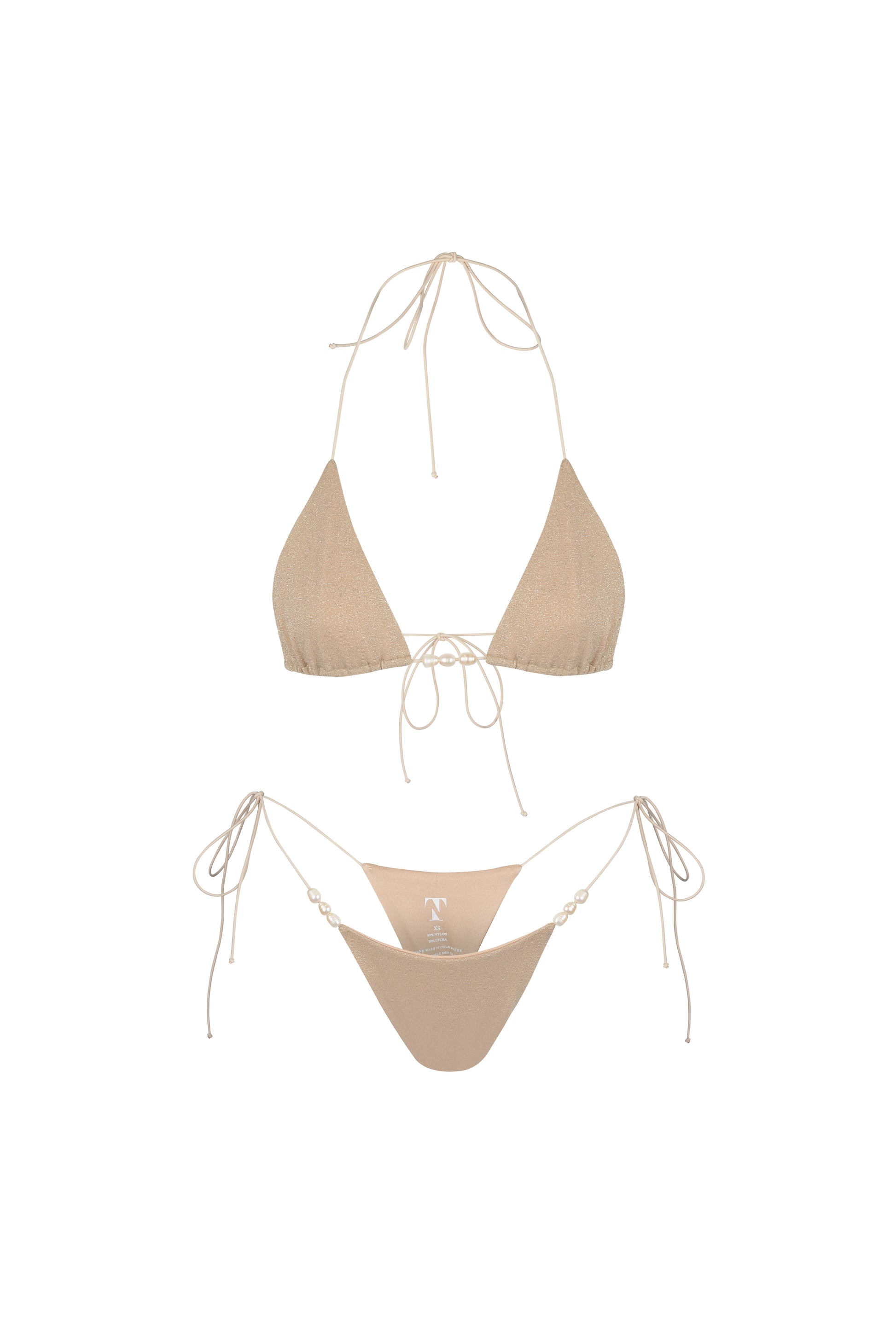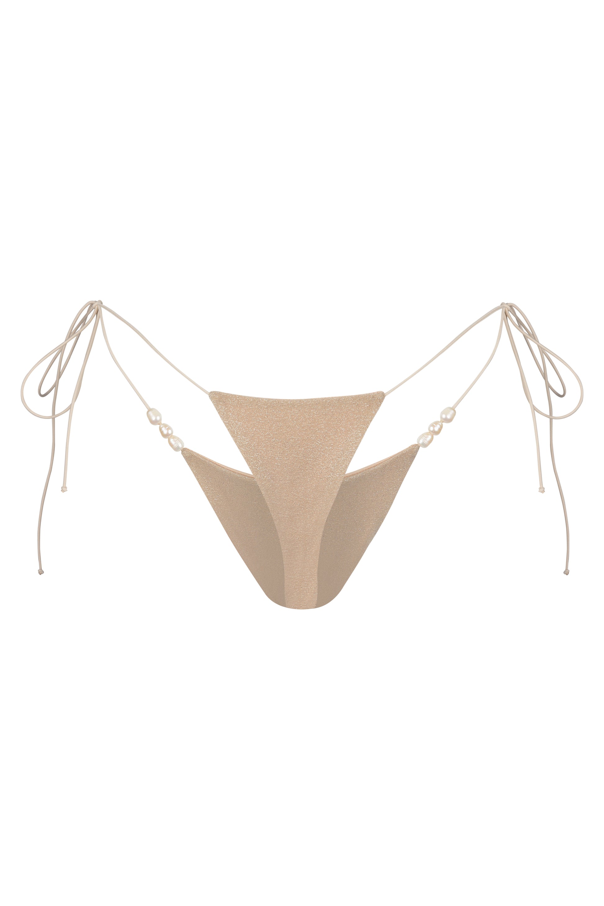 Indulge in luxury with our beige bikini bottom, exquisitely designed to add a touch of elegance to your beachwear collection. This bikini bottom features a sophisticated nude champagne hue that complements any skin tone, offering a timeless and chic aesthetic. The standout detail is the delicate pearl beading on the tie sides, adding a glamorous and feminine touch to your swimwear. Whether you're sunbathing by the pool or taking a dip in the ocean, this bikini bottom ensures you do it in style.