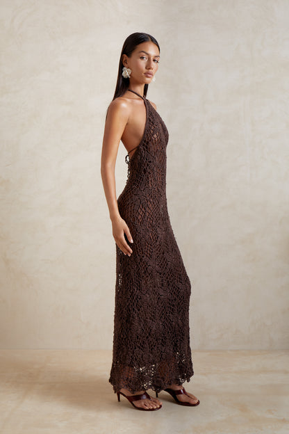 The Lotus Dress is a captivating hand-crocheted maxi dress that channels bohemian elegance with a modern edge. Featuring an intricate open-knit pattern and halter neckline with keyhole detail, it subtly reveals and accentuates your silhouette while maintaining an effortless sophistication.