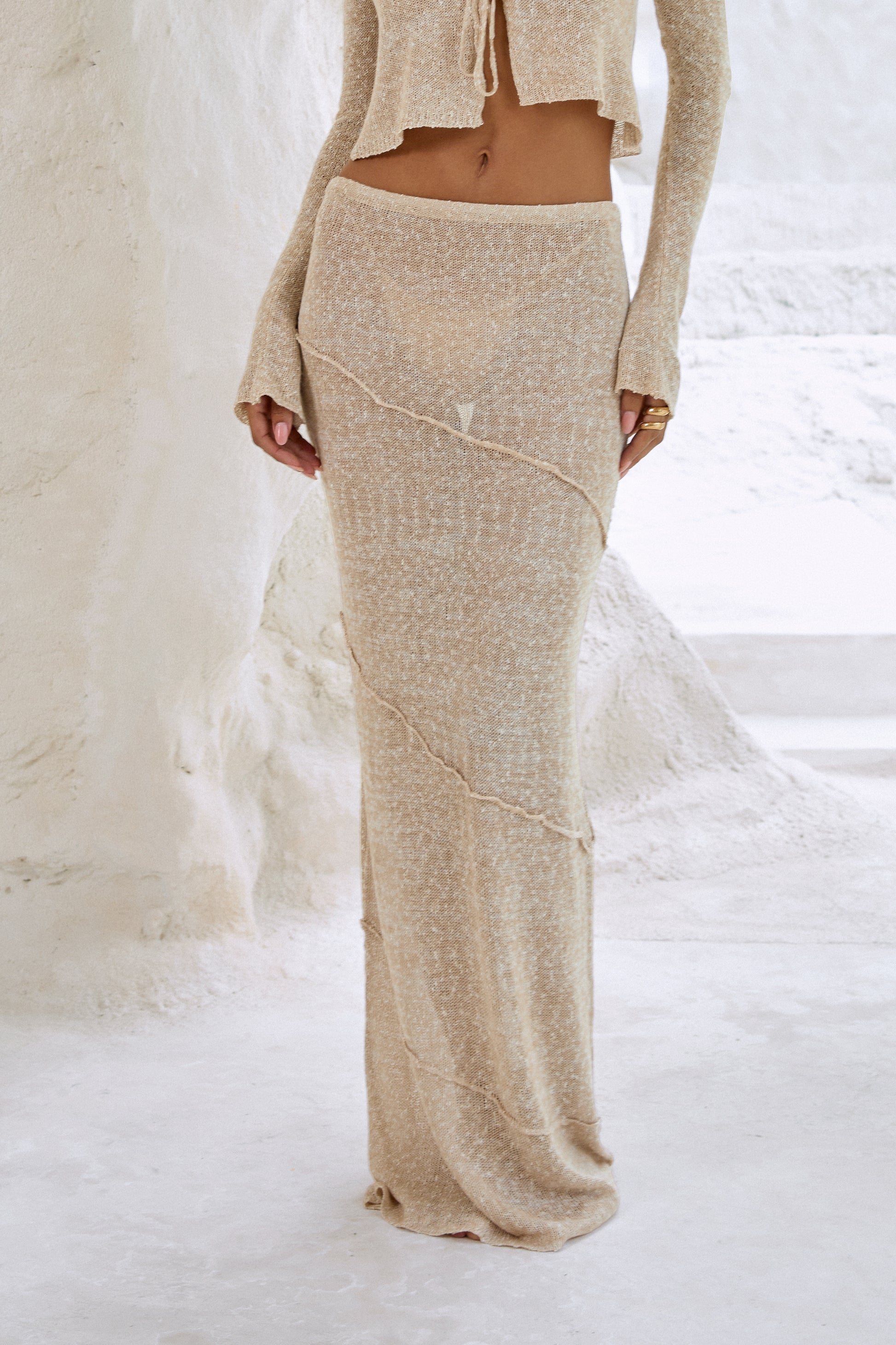 This textured, sheer long skirt in green is ideal for layering over a bikini. Pair it with the long-sleeved top for a sleek coordinated look.