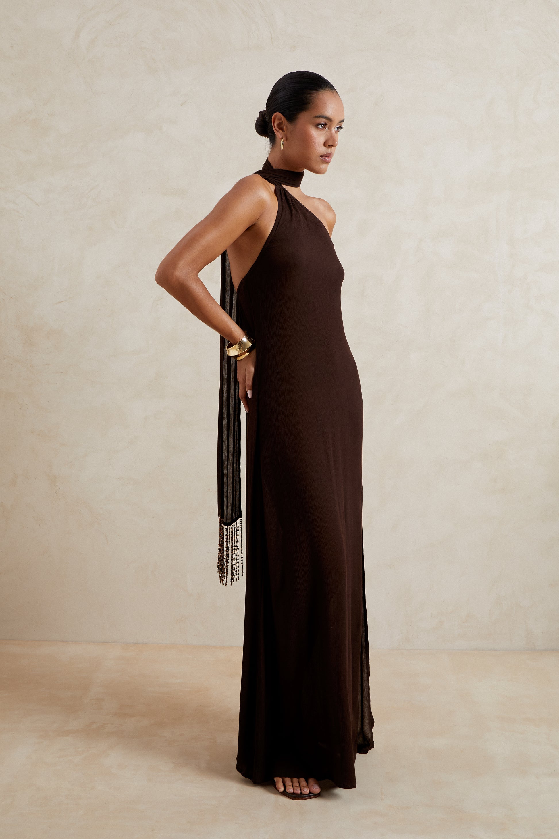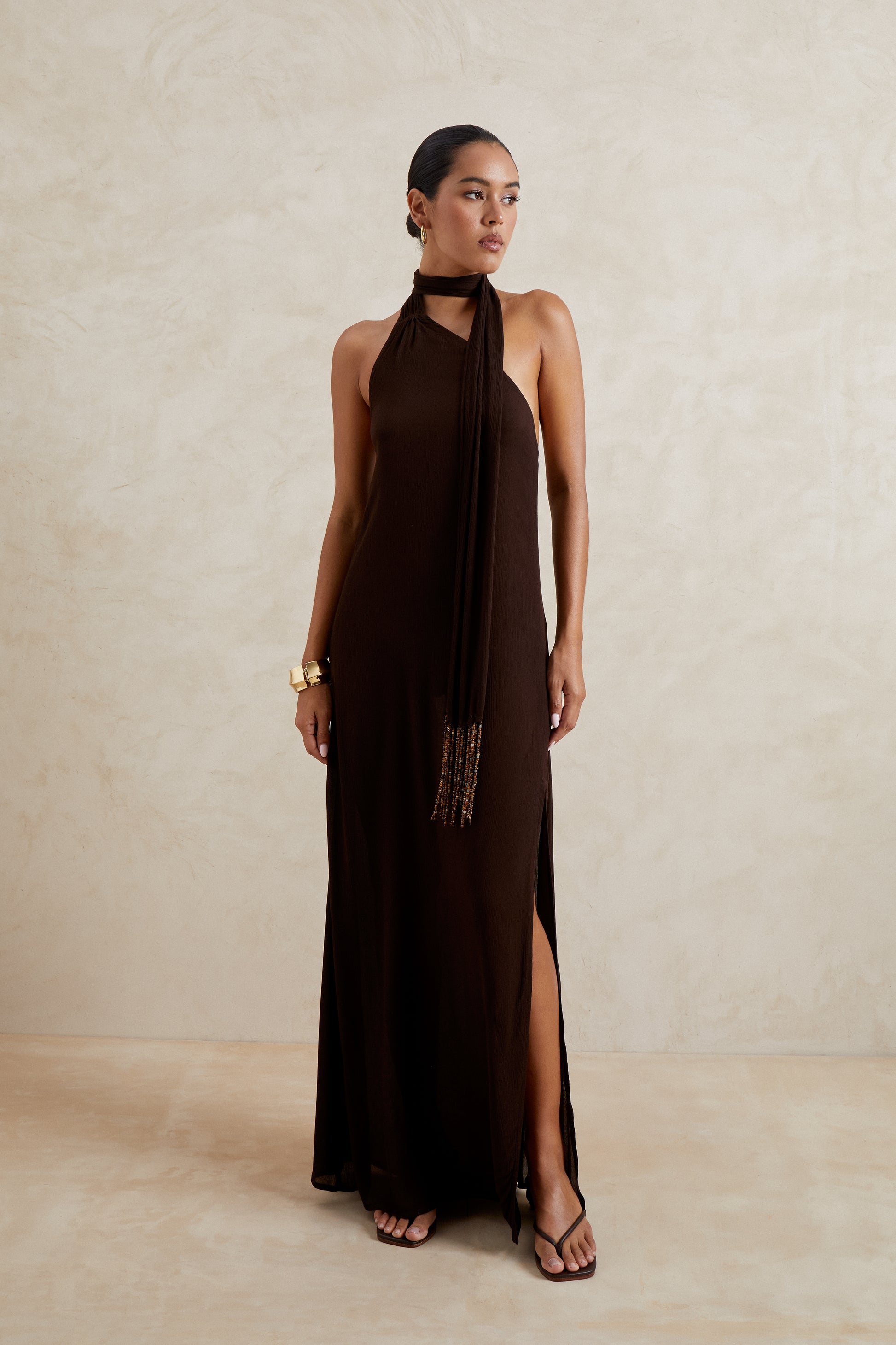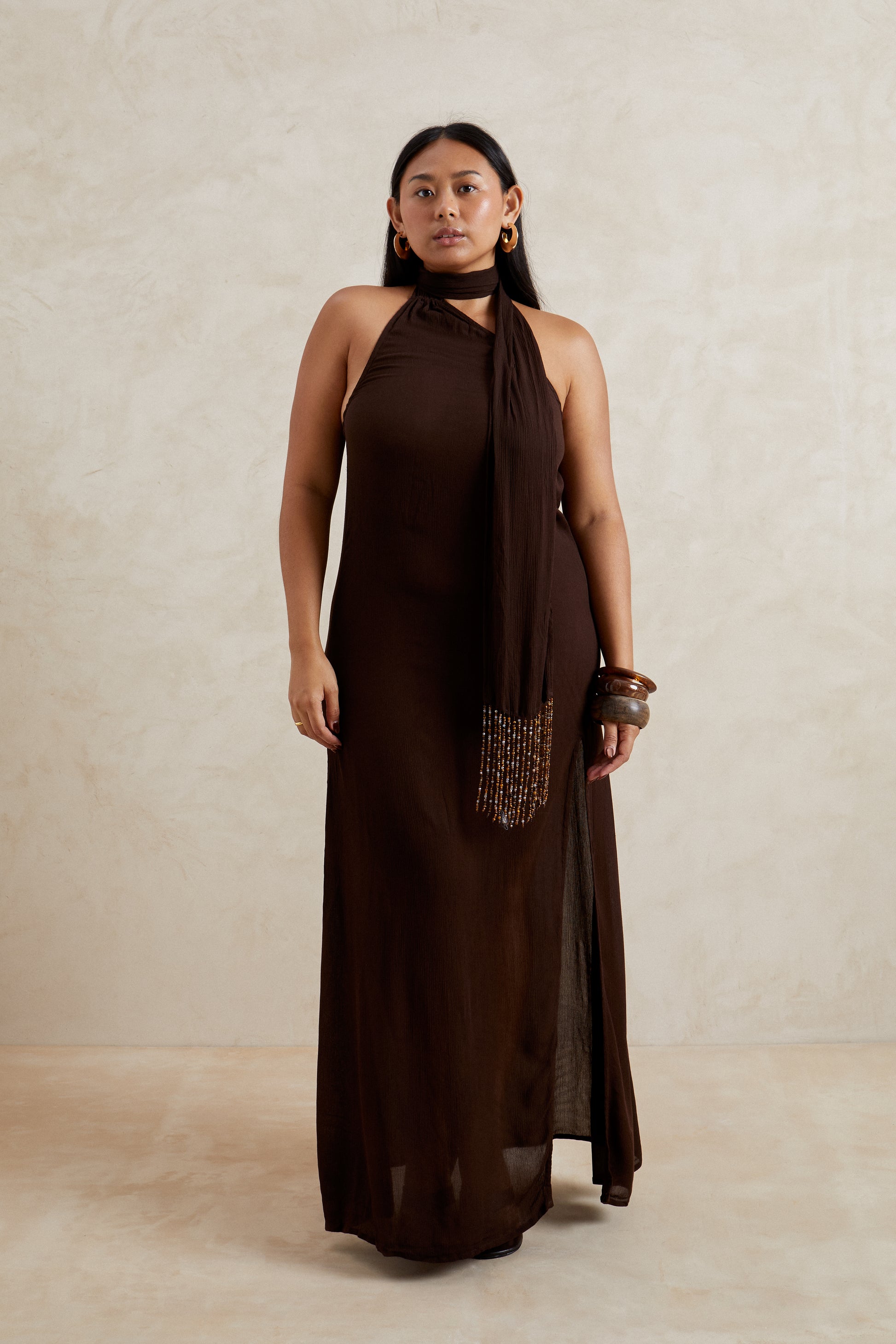 The luna dress in brown embodies refined confidence and timeless sensuality. featuring a halter neckline with elongated scarf detail finished with delicate beading, it brings a touch of drama to its clean, floor length silhouette. the thigh-high split adds fluidity and edge while the rich brown tone grounds the look in effortless sophistication. Perfect for evening occasions or elevated resort dressing.