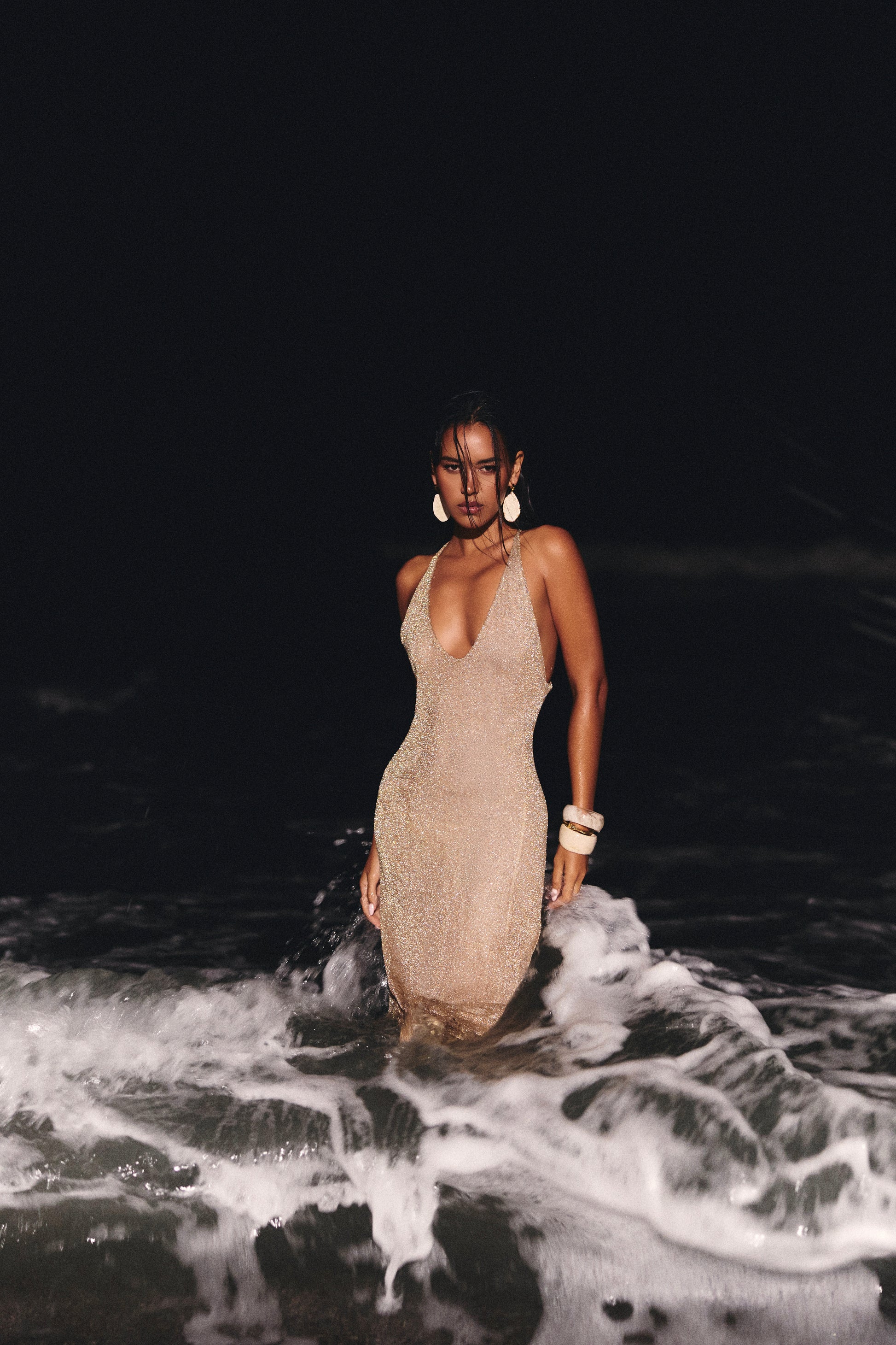 The Tiara Dress is crafted from a fluid, hand-knitted gold and silver woven fabric. It features a deep V-neckline and a sleek midi-to-ankle silhouette. The subtle shimmer and minimalist design create the perfect balance of elegance and sensuality, making it ideal for golden hour moments and evening occasions.